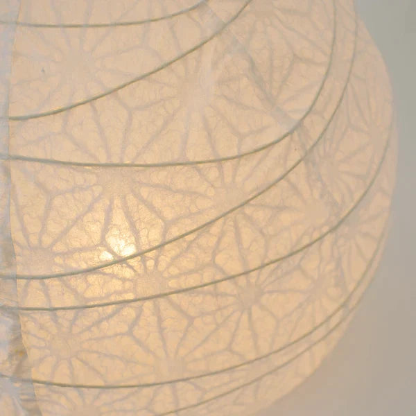 麻の葉模様の美濃手すき和紙です。灯りを透すと麻葉模様がとても綺麗に見えます。縁起の良い柄とされており、鬼滅の刃では、竈門禰豆子の麻の葉柄の着物としてお馴染みの柄となりました。